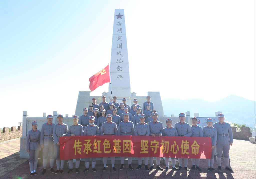 “我志愿加入中国共产党,拥护党的纲领……”铿锵有力的誓词在苦湖突围战纪念碑下响彻,全体党员面向党旗,郑重举起右手,重温入党誓词,引导党员更好地领悟初心、践行使命,做模范践行誓词、忠诚捍卫党章的合格党员。