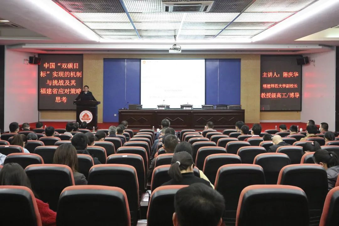 陈庆华教授详细剖析了碳达峰与碳中和有关知识,全面阐述了全球气候紧急状态和碳排放现状,国家实现碳达峰碳中和目标的战略意义,以及准确把握习近平生态文明思想体系的深刻内涵,福建实现“双碳”目标的机遇和潜力,福建省在响应国家碳达峰与碳中和战略中的思路和举措。陈庆华教授还结合自身丰富的科研经历和实践经验,就低碳经济条件下创新人才培养模式的探索做了精彩阐述,同时对师生们如何激发干事创业斗志、提高工作效率、提升幸福感提出了诸多建议。