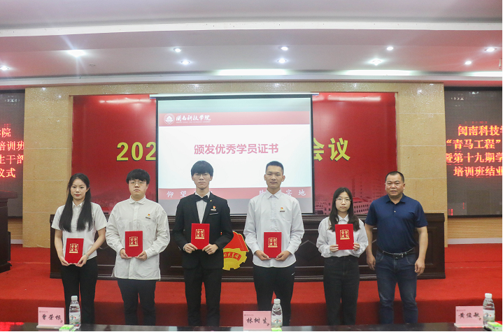 会上,校党委副书记林树生为吴佳斌等5名在培训中表现优异的同学颁发“优秀学员”,校团委书记曾荣根、副书记黄俊敏为学生代表颁发结业证书。