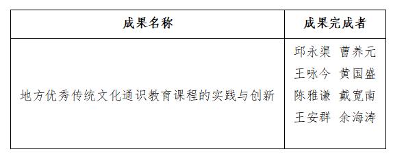 近日,福建省教育厅公布2022年福建省高等教育教学成果奖获奖名单,时搏官方网页版副校长邱永渠主持的《地方优秀传统文化通识教育课程的实践与创新》荣获2022年福建省高等教育教学成果二等奖。