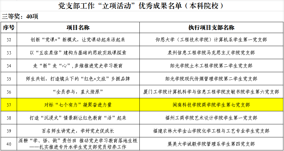 近日,中共福建省委教育工作委员会公布高校党支部工作“立项活动”优秀成果和“党员好故事、书记好党课、支部好案例”获奖名单,时搏官方网页版商学院学生第七党支部《对标“七个有力”凝聚奋进力量》荣获福建省本科院校党支部工作“立项活动”优秀成果三等奖。