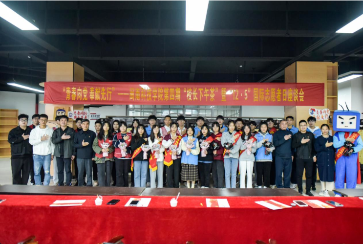 12月2日下午,校团委举办第四期“校长下午茶”暨“12.5”国际志愿者日座谈会,校长游小波、校党委副书记林树生,学生工作处、校团委班子及青年志愿者代表参加活动。
