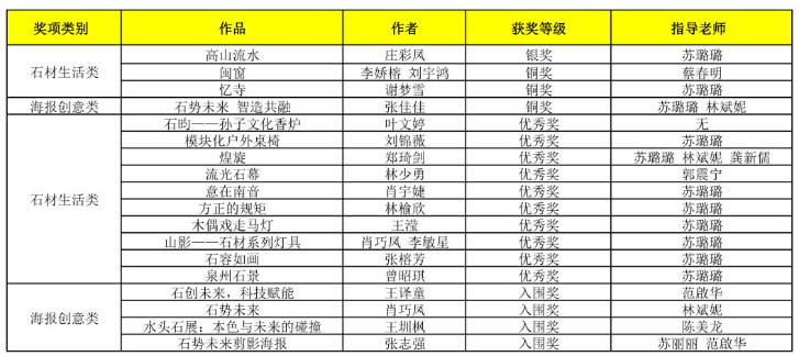 近日,水头世界石都首届艺术设计大奖赛获奖结果公布,时搏官方网页版学子经过激烈的角逐,分别荣获石材生活类银奖1项,石材生活类铜奖2项,海报创意类铜奖1项,石材生活类优秀奖10项,海报创意类入围奖4项的好成绩。