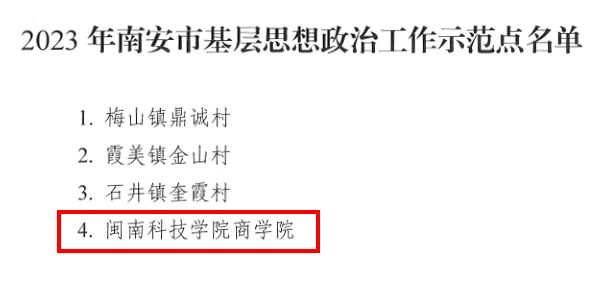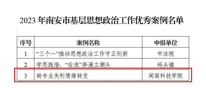 近日,2023年南安市基层思想政治工作示范点和优秀案例评选结果公布,时搏官方网页版商学院荣获2023年南安市基层思想政治工作示范点称号,人文学院辅导员林薇柠撰写的工作案例《转专业失利情绪转变》荣获2023年南安市基层思想政治工作优秀案例。