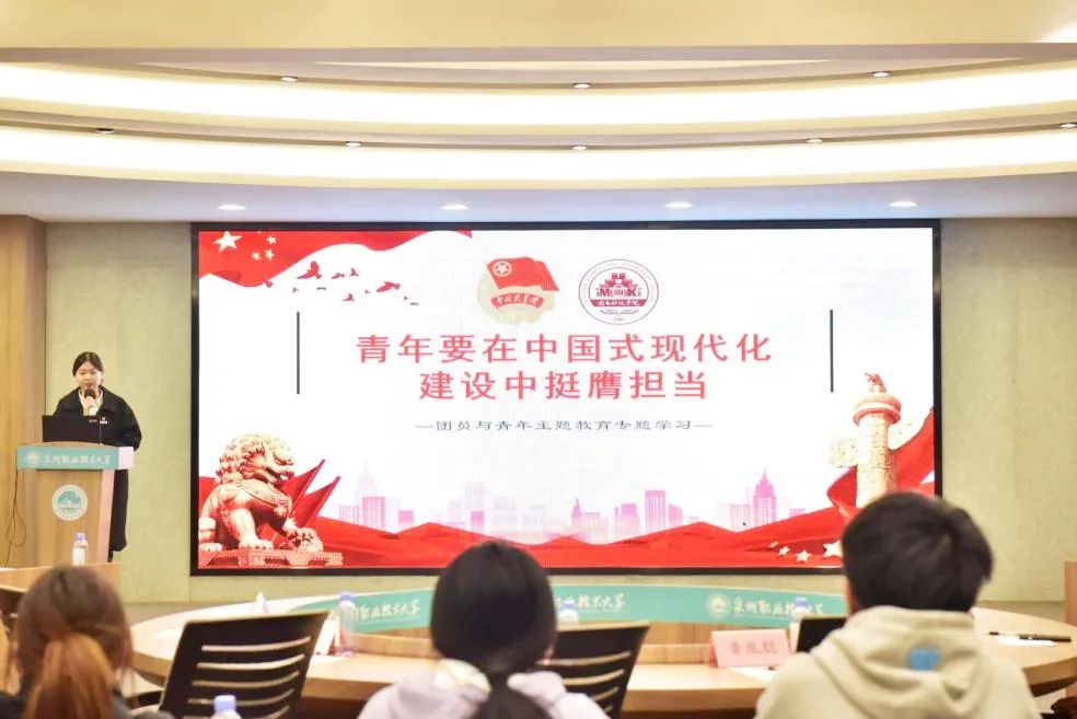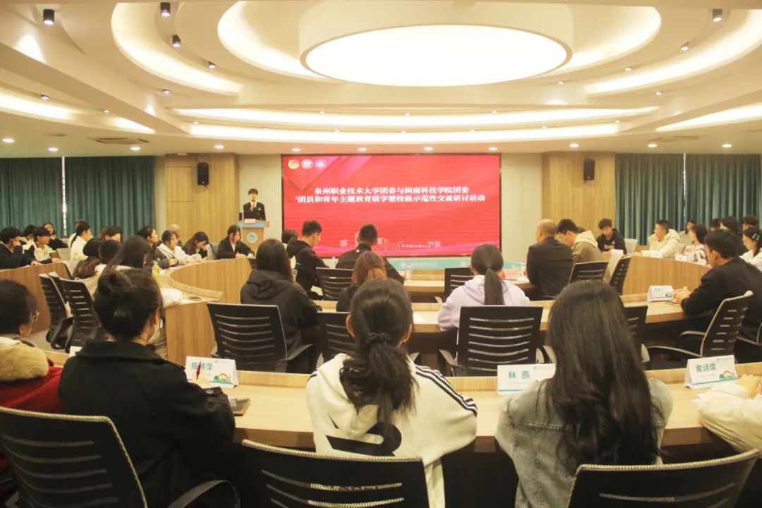 12月27日,时搏官方网页版团委与泉州职业技术大学团委开展团员和青年主题教育联学活动,深入学习习近平新时代中国特色社会主义思想,聚焦“铸牢对党忠诚、坚定理想信念、发扬斗争精神、勇于挺膺担当”主题,开展辅导报告、主题宣讲和交流研讨,扎实推动团员和青年主题教育走深走实、见行见效。两校团委负责人、团委工作人员,“青马工程”培训班学员代表等近百人参加。