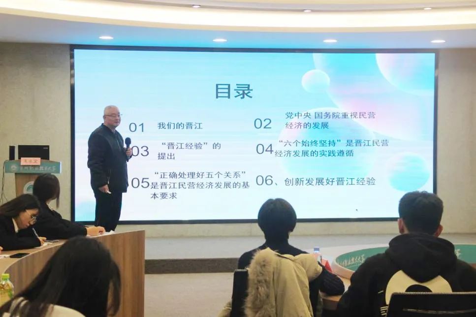 学习会上,泉州职业技术大学校务顾问、马克思主义学院院长来永宝教授作题为《做新时代“晋江经验”的传承人》专题辅导报告,来永宝教授通过鲜活生动的案例,围绕党中央始终坚持“两个毫不动摇”、“三个没有变”“六个始终坚持”和“正确处理好五个关系”等方面,深刻剖析了“晋江经验”的思想精髓、实践价值和丰富内涵。整场报告主题鲜明、内容丰富,为学员们学习和传承“晋江经验”上了一场生动的“思政课”。