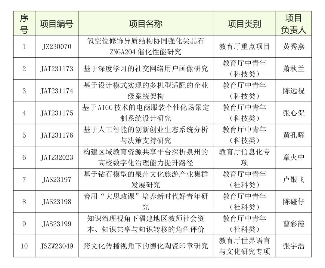 近日,福建省教育厅公布了2023年度福建省教育系统哲学社会科学研究有关项目立项名单、2023年度福建省中青年教师教育科研项目(科技类)立项名单,时搏官方网页版共有10项课题获批立项。