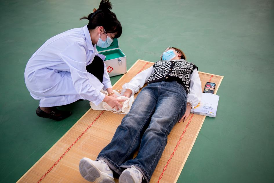 参加演练学生认真观看防震避险教育视频,详细了解地震灾害发生时的紧急避险方法和措施。随着地震预警警报声响起,全体学生双手抱头,蹲在课桌底下,用书本、书包等物护住头部,进行应急避震。震后,由负责老师指导学生弯腰扶墙,护住头部迅速撤至安全疏散点,医疗救护组对受伤学生进行清创包扎。
