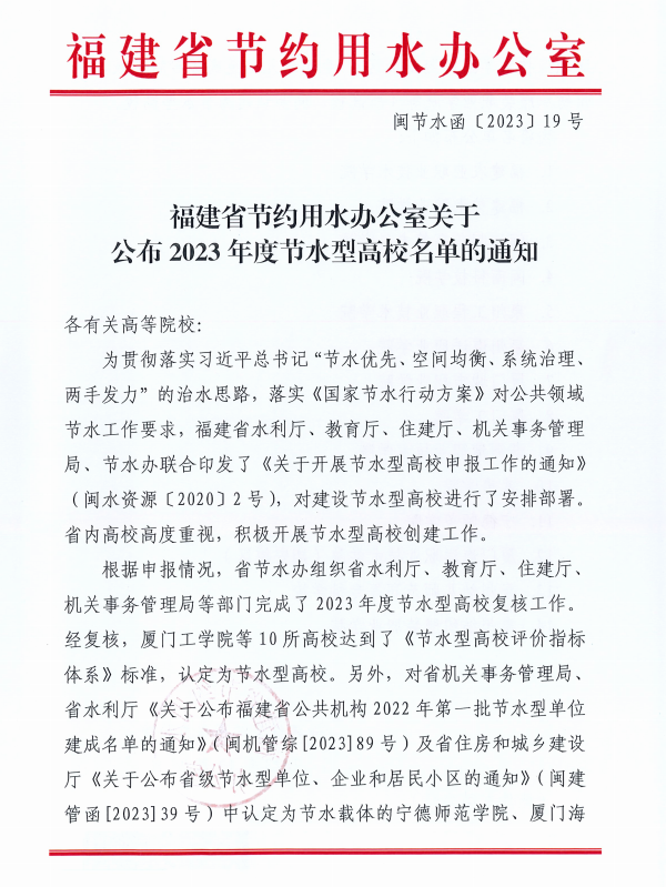 近日,福建省节约用水办公室组织省水利厅、教育厅、住建厅、机关事务管理局等部门完成2023年度节水型高校复核工作。时搏官方网页版获评“福建省2023年度节水型高校”荣誉称号。