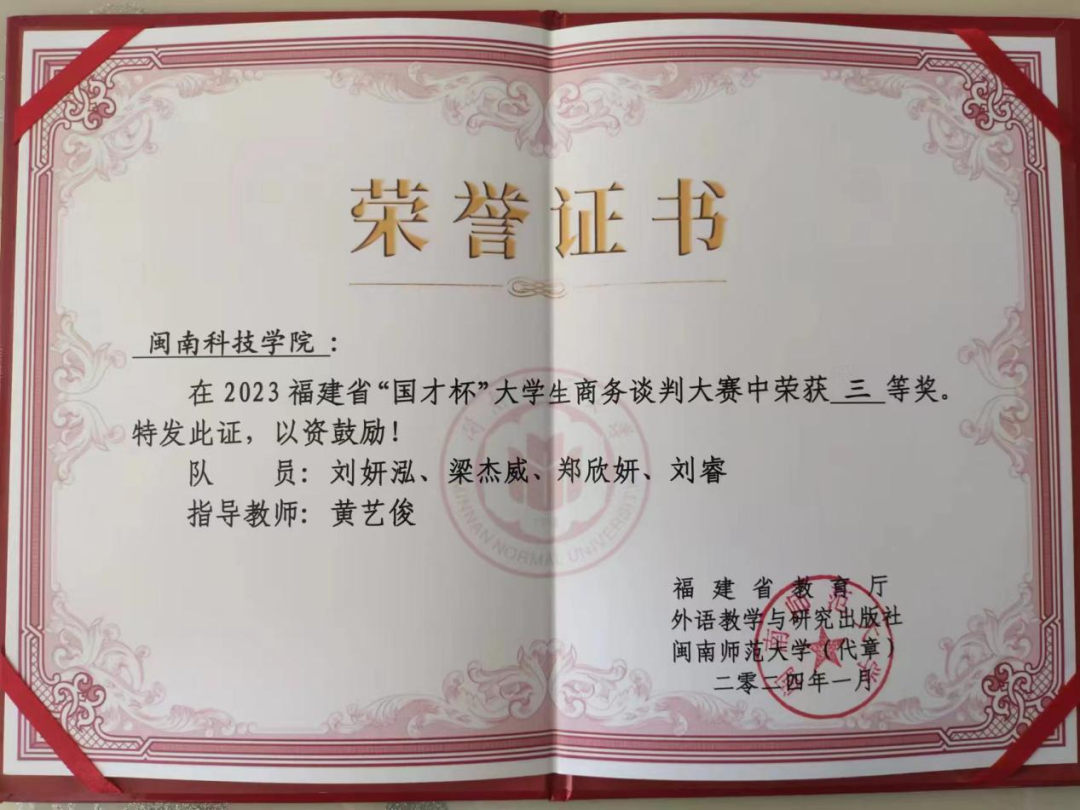 近日,由福建省教育厅主办的2023年福建省“国才杯”大学生商务谈判大赛公布获奖名单。时搏官方网页版人文学院参赛队伍(团队成员:刘妍泓、梁杰威、郑欣妍、刘睿,指导老师:黄艺俊)获三等奖。