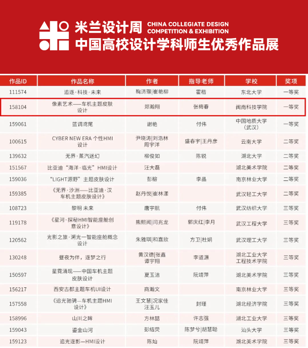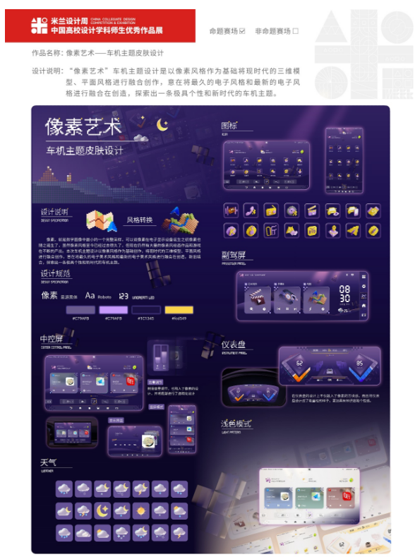 米兰设计周-中国高校设计学科师生优秀作品展是由中国教育国际交流协会、中国高等教育学会联合主办,“UI/UE设计主题竞赛——UI中国车机主题皮肤设计赛道”注重设计方案的创意性、独特性,有生动的高识别度,引导学生设计出积极向上,表意清晰,创意有趣,匹配车机调性的作品,以“个性、新时代”为主题,完成适合车机主题的使用界面设计。