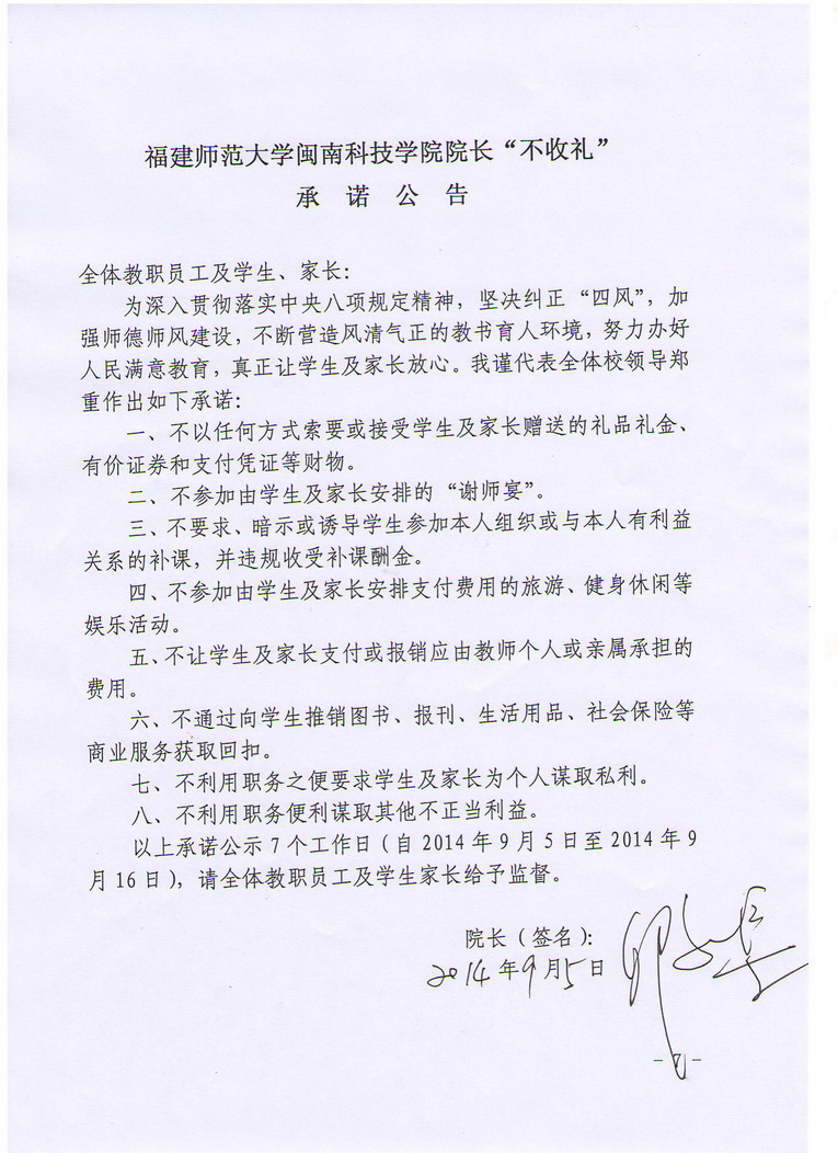 福建师范大学时搏官方网页版院长“不收礼”承诺公告
